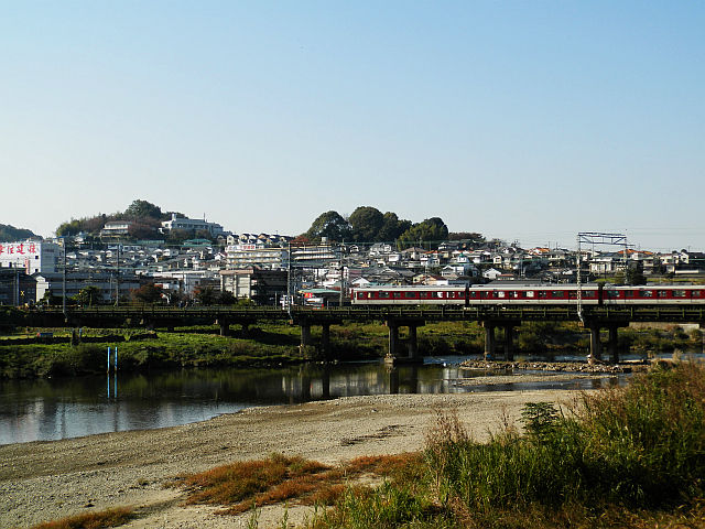 大和川と近鉄の大和川橋梁を挟んで、真ん中の小山がそうです。頂上付近には老人ホームと宗教団体の施設があって、残念ながら近寄れなさそうでした。