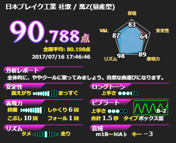日本ブレイク工業社歌はDXで初の90点越え。3つキー下げたらちょうど良い感じ。「ややクールに歌ってみましょう」って言われても、あんな歌だし…。