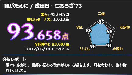 DAMさんはこんな言葉でめっちゃ褒めてくれます。 「1つ1つの音が生き生きと聴こえてきます」 「聴いていて楽しい気分になります」 「心に伝わる澄み切ったキレイな歌声」 「耳を奪われ、惚れ惚れしました」おまえ!機械のくせに!! 万事こんな調子かと思ったら、90点台でも「声に強弱をつけすぎて、やや不自然に聴こえます。手元からマイクを離しすぎないように。」とか結構言ってくるんですよ…アメとムチってやつでしょうか…。
