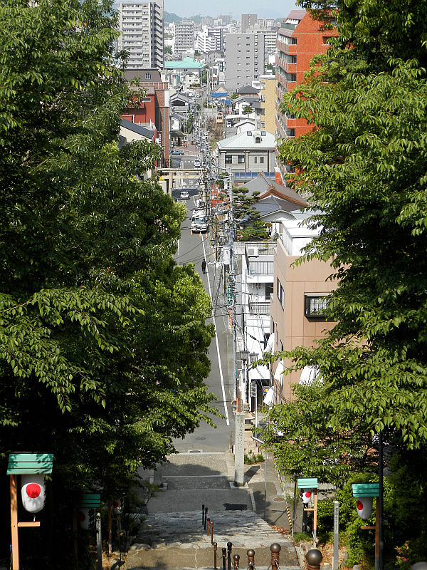 伊予鉄道の道後温泉駅前にある、坊っちゃんカラクリ時計 この前の通りが、伊佐爾波神社の参道です。 伊佐爾波神社の石段 上から見た参道。観光絵図を思い起こしながら見て回るのも楽しかったです。またじっくり歩きたい。