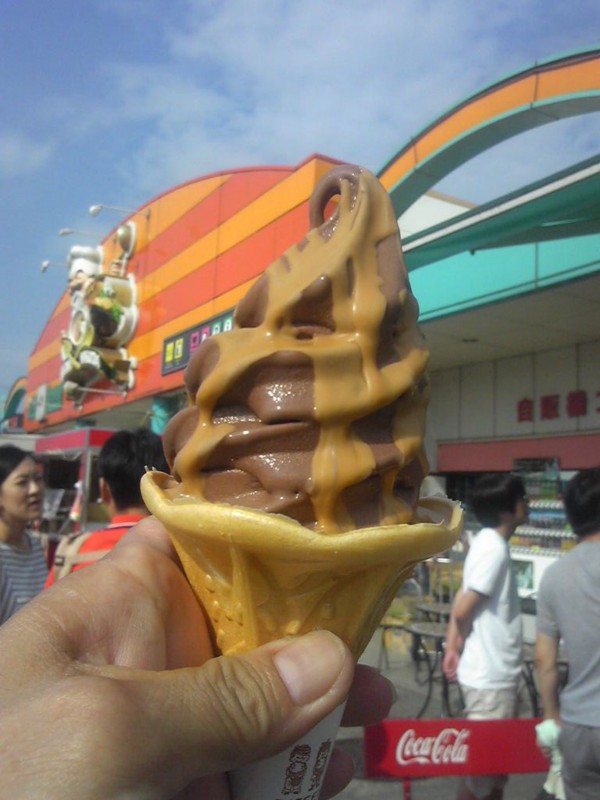 蓮田についたら暑かったのでとちおとめスムージーのあと、調子にのってショコラソフトの焦がしキャラメルソースがけ。案の定、お腹冷やしました。