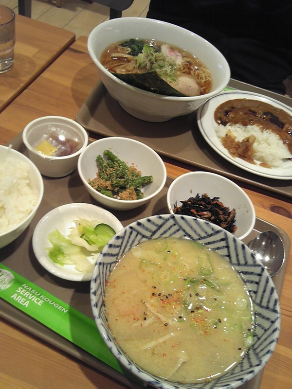 福島・薪ストーブ始動!の陣より帰還の途上、那須高原SAにて、ラーメン&ミニカレー(ダーリン)と那須豚の豚汁定食の遅いお昼。