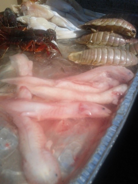 野毛大道芸にて珍獣屋のウーパールーパー、グソクムシ、ザリガニ、カエルモモの唐揚げ各1000円