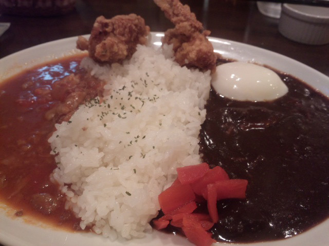 ハヤシとカレーの愛がけ♡+カラーゲ&温玉のにぎやかプレート