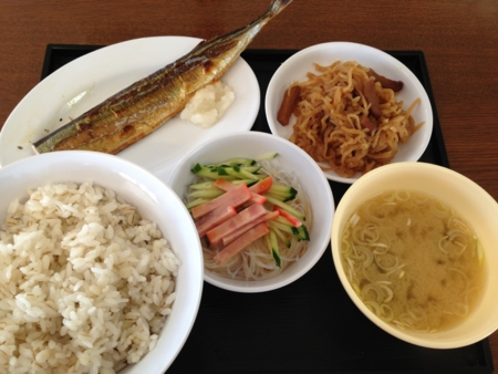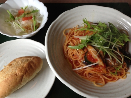 サンマとナスとズッキーニのトマトソース味で食後にコーヒーとデザートがつきます。