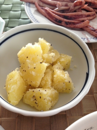 今日はイカを炒めたり、新ジャガを、茹でて粉ふきイモにしたり、魚と朝の残りの味噌汁でした。