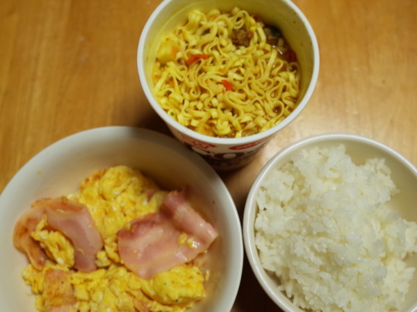 今夜はベーコンとたまごの焼いたん、COOPヌードル(カレー)、白ごはん