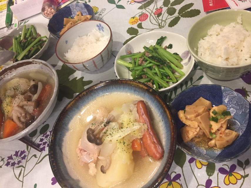 冷蔵庫を空にするため、メニューがしっちゃかめっちゃかです。
