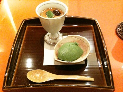 祇園ご飯デザートは、抹茶アイスときな粉風味パンナコッタ。