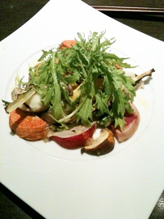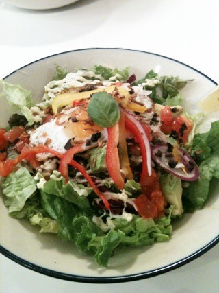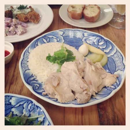 Irving Placeでサラダバーの野菜とシンガポールチキンライス。