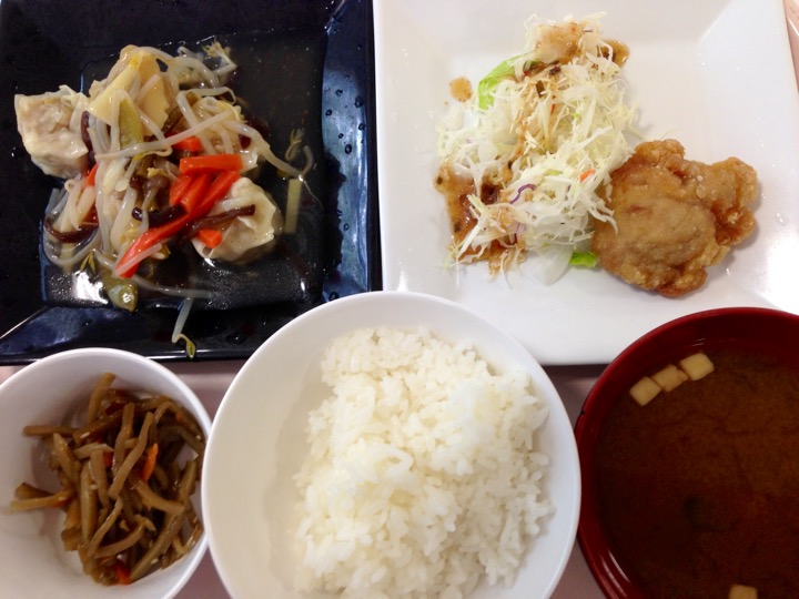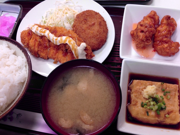 内容は、南蛮チキンカツ、コロッケ、唐揚げスイートチリソース、揚げ出し豆腐、ご飯、味噌汁、お新香がついて680円!