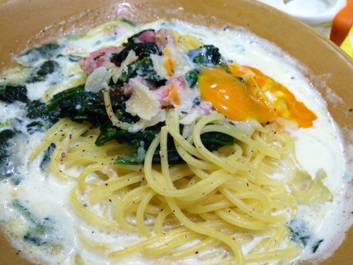 ショッピングモールのフードコートにて、ほうれん草のカルボナーラ(麺1.5倍)。