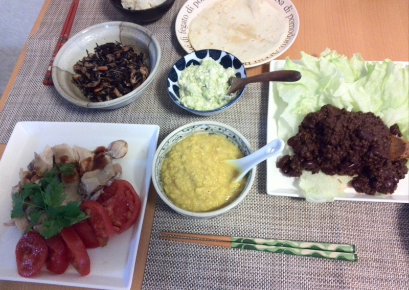Shinji さんの作られたチリコンカンと、インドのムングマメと大根のお粥をいただきました。
