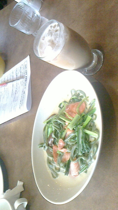 ほうれん草を練り込んだ糖質50%オフのフィットチーネのスモークサーモンのクリームソースとアイスカプチーノ