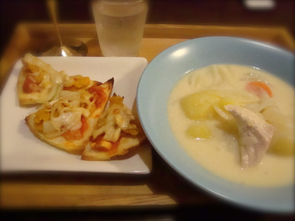 クリームシチューとかんたんピザで晩ごはんにしました。