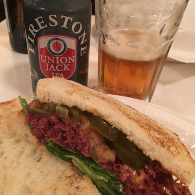 バーガーマニアでコーンビーフサンドウィッチハラピーニョ追加トマト抜きあんどビール。