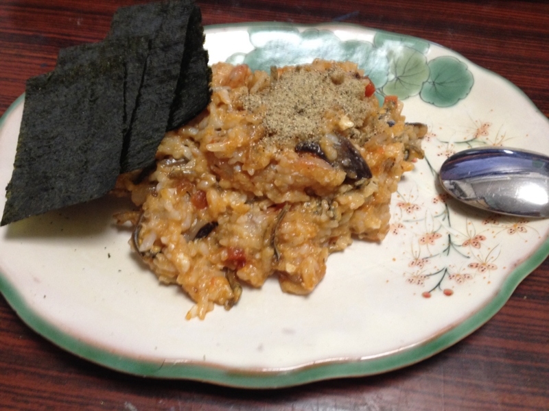 その残りの水を飛ばしながらチキンライス向けのケチャップを混ぜたものがこちらになります。チーズのかわりにイワシの粉末が載っています。