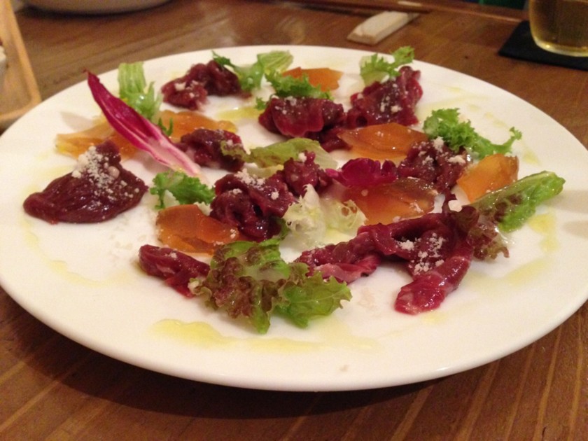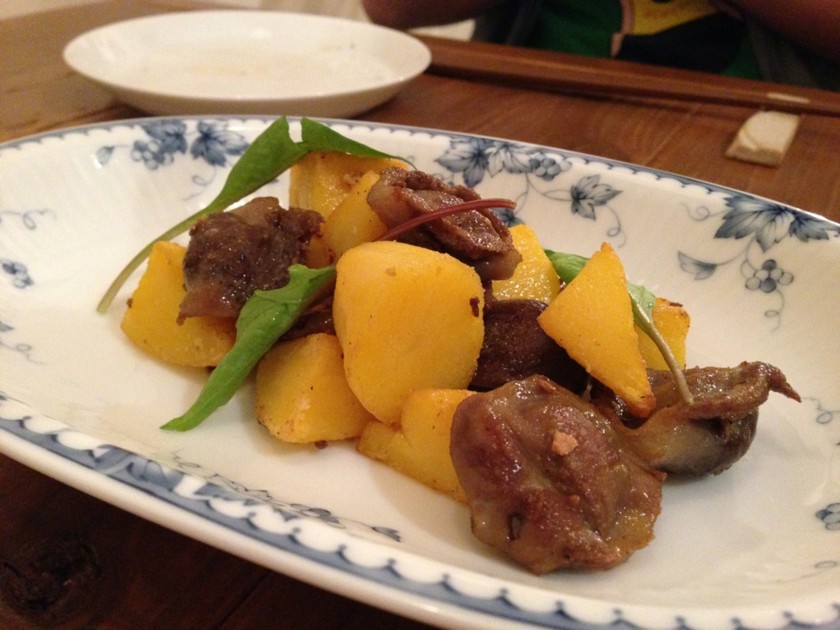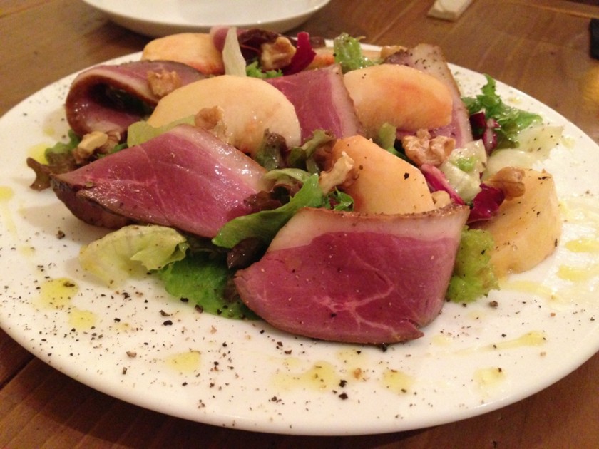 門屋にて、マグレ鴨の燻製と桃のサラダ、キタアカリと砂肝のコンフィ、馬肉カルパッチョ、子羊のロースト