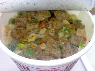 あの肉……かと思ったけれど、こしょうがすごく効いているので、何だか粗びきソーセージをふやかせたみたい。