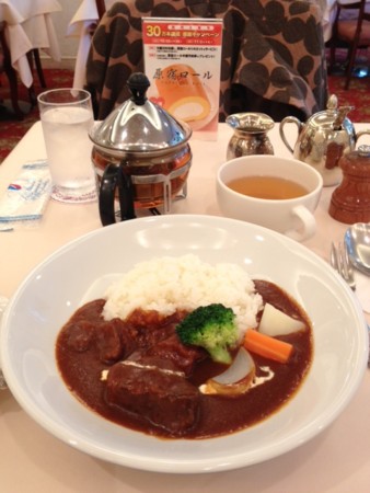 原宿コロンバン、ランチに無料でロールケーキの1/4カットがデザートについてくる! 30万本達成感謝キャンペーンだそう。先着200名とあるけど、原宿だし各日かな。というわけでまずはランチでビーフシチュー。