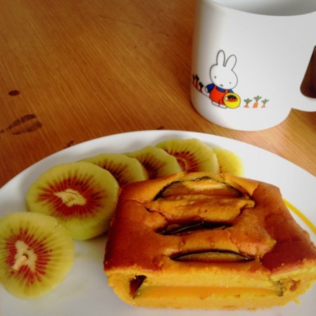 昨夜焼いたかぼちゃのチーズケーキ。種周りの赤いレッドキウイと。断面は奈良美智の描く子どもみたいになってるけど、万聖節だしなにか憑いたかな。