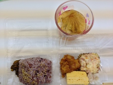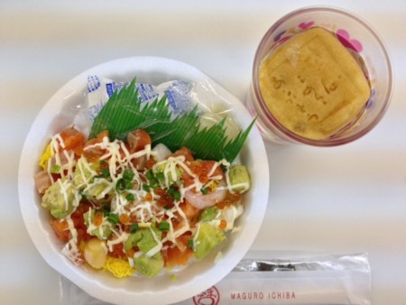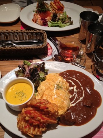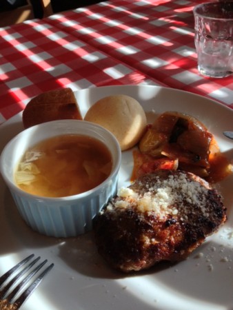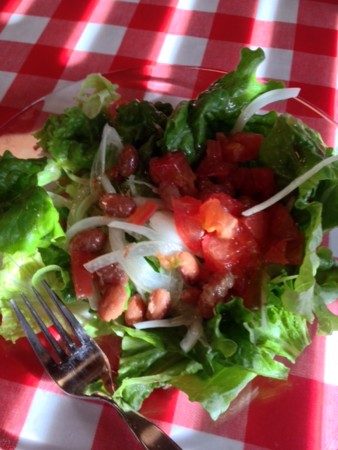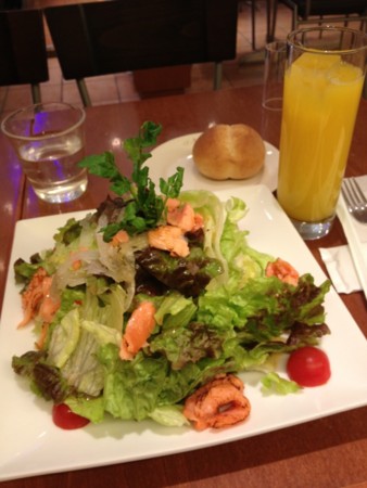 今日はサラダの上にイタリア風ポークビーンズ(ポークがサルシッチャっぽい)とトマトがのってる。メインはイベリコ豚のハンバーグ。