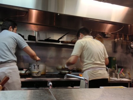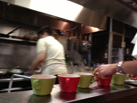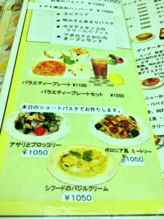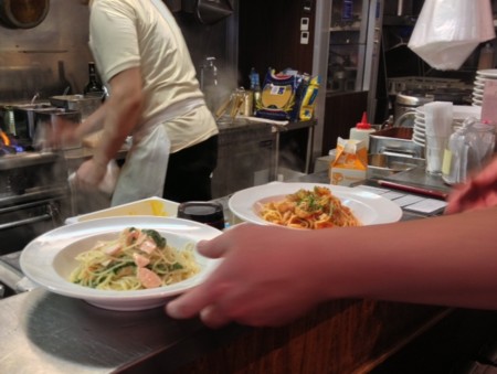 巨大なカンパリのある窓辺でシーフードのホワイトソースピザと、海老と紅ズワイガニのパスタ。カンパリの右に置いた新書は大きさ比較用。