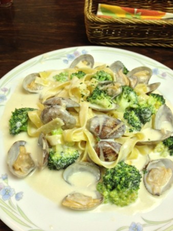 アサリとブロッコリーのクリームフェットチーネとロールケーキ♪