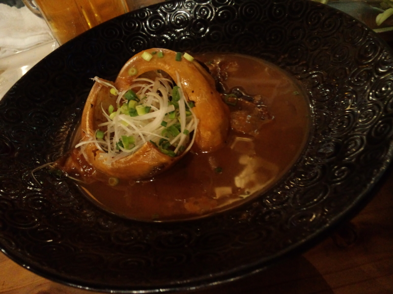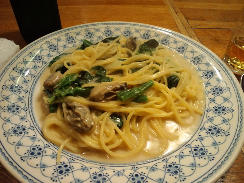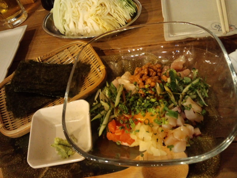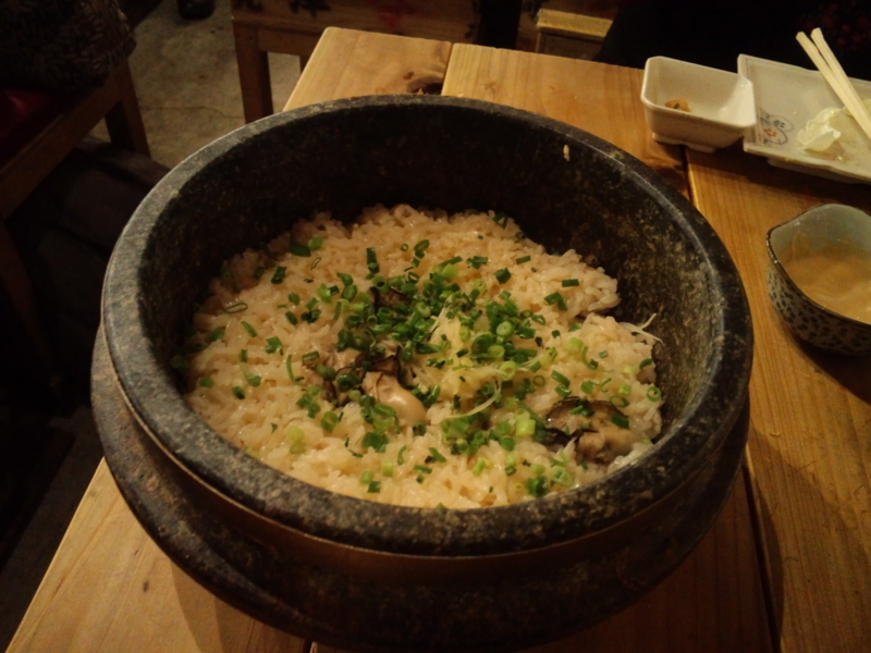 パリパリキャベツと海鮮バクダン、マグロの目玉煮、牡蠣の石鍋ごはん。うまー!