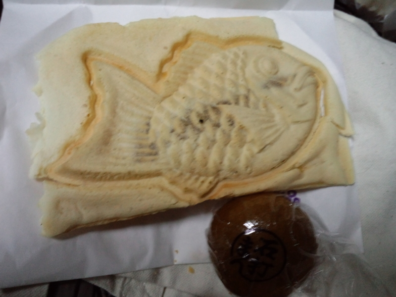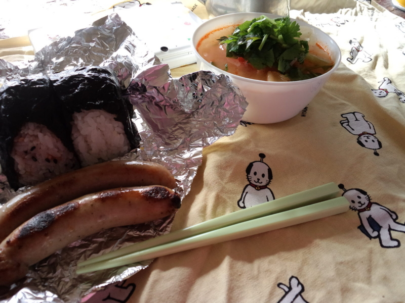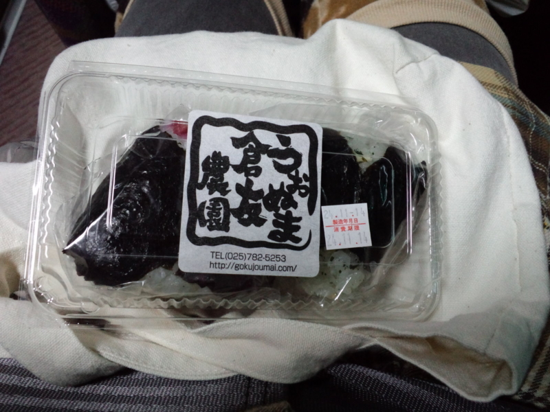 魚沼こしひかりのおにぎり(梅・しらす)と、パリパリ羽根つき鯛焼き(芋あん)、石打まんじゅう。写ってないけど、トン串(塩)と玉こんにゃく串と味噌ダレポテト串も半分こずつ、いただきます。