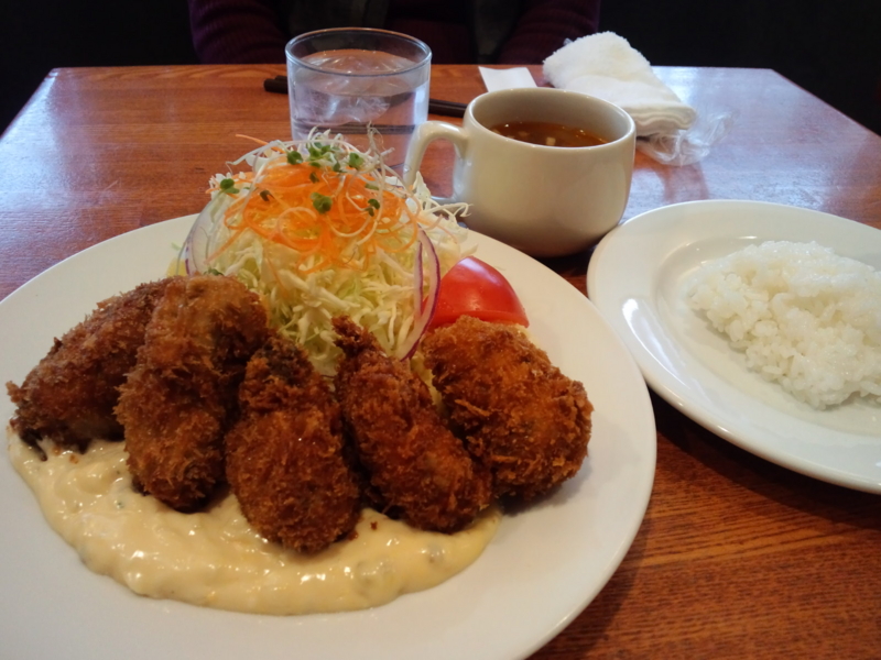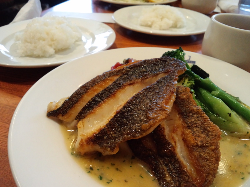 黒ソイのポワレ。母はカキフライ。ボリュームたっぷりです。おいしかったぁ!
