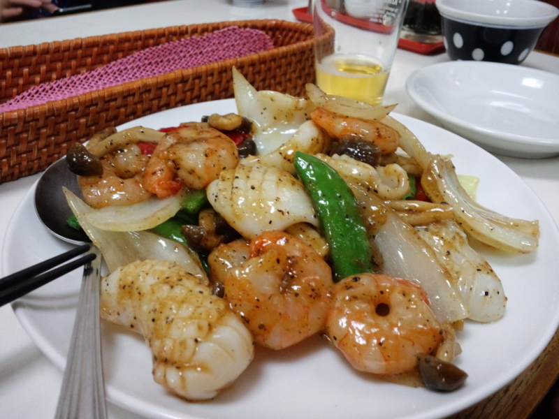 徳記で蒸し鶏の坦々麺と海鮮黒胡椒炒め&ビール!