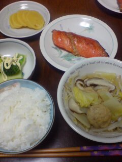 焼き魚(紅鮭)、サラダ、ほうれん草のお浸し、きんぴらごぼう、