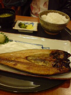 ホテルのレストランでホッケ定食を息子が食べてます。