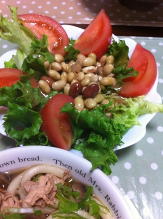煮豆とトマトとサニーレタスのサラダ