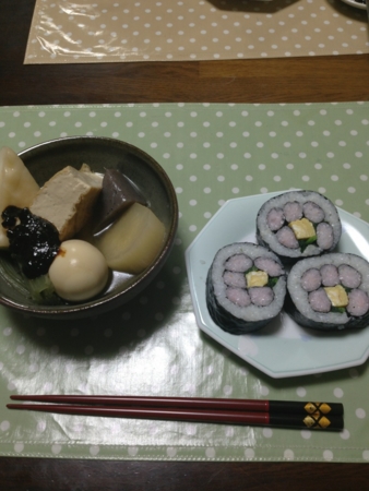 おでんと花巻き寿司にしてみました。