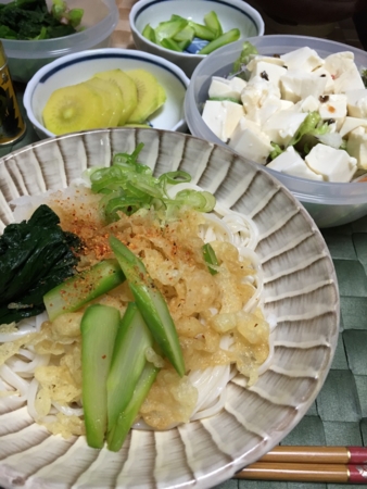 冷たいうどんに自作天かすやまめ夫作大根おろしなどを載せて。