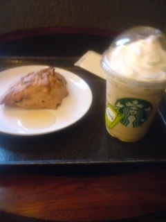 スタバでブルーベリースコーンと、アイスのソイラテ。映画の半券でホイップ無料のせ。