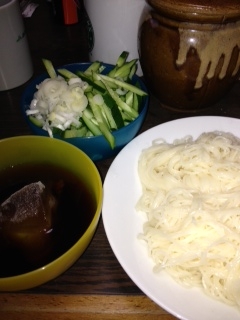 きゅうり1本とねぎを適当にきざんだものと、うめぼしと氷をぶちこんだそうめん、美味しーい♪( ´▽`)