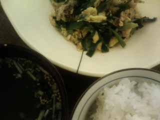 ニラ玉、炊き立てのご飯、蜆とめかぶのスープ。