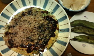 コロ父が飲み会なのでお好み焼きを焼きました。いただいた空豆はブログで見ていていつかやってみたいと思っていた鞘ごとやきました。お腹がなっています。