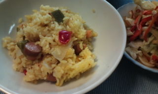 パプリカご飯をいただきました。うちの菜園でとれたパプリカを差し上げたら作って持ってきてくださいまし。パプリカご飯は初めて。いただきま〜す♪