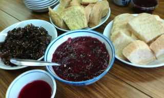 梅の黒焼きはまだ完成に行き着きませんが、ローゼルジャムはお手製の天然酵母パン(作って来てくださった)につけていただきましたがパンが美味〜、ジャムが美味〜!。生姜の佃煮、生姜の甘酢付け、サツマイモの麹きんとんも作ってきてくださってて、どれも美味しく、ご飯が欲しくなった。料理上手な方々、うちにお嫁に来て〜。