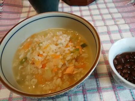 ご飯を汁に入れふやかしたぐらいで食べられるようになったので昨日の寄せ鍋の汁に出汁を足し、小さく切った野菜を柔らかく煮たところにご飯を入れ、ちょっと煮て溶き卵を入れて蒸らした。
