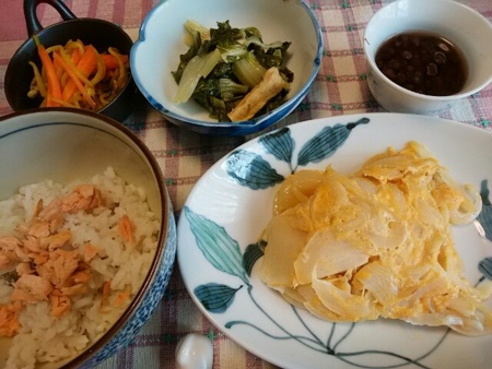 今日はしゃくし菜が柔らいし新タマネギの卵とじもモヤシと人参のピクルスも食べられる。