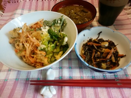 コロ父が月一度の昼食会に行ったので、残っていたかき揚げやレンコンの天ぷらを追加。
