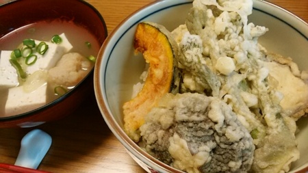 野菜の天ぷらばかりだったのでエソの団子と豆腐でたんぱく質をとる。