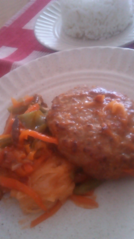 と勇んで冷蔵庫を開けたら卵がなかったので、ハンバーグを食べます。