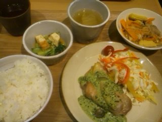 タニタ食堂に来ましたよ。私は「チキンのジェノバクリーム定食」をいただきました。総カロリーは493kcalだそうです。お腹いっぱい!味はどれも薄めだけど物足りなくなかったな。もう一種類はサワラのカッテージチーズ定食でした。