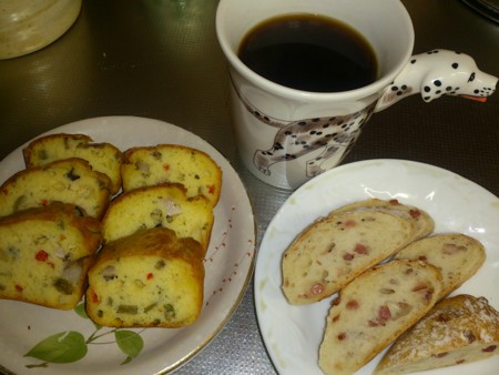 昨日フランスフェアで買った「ビストロ・ヴェー」のケークサレと「オ・ルヴァン・ダンダン」のベーコン入りバケット。ケークサレ結構塩気強いね~。お酒と合わせた方がいいかもしれないけど昼間だしこれだけでいただきます。